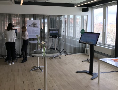 Ett golvstativ med en pelare som är 145 cm hög. På bilden är det med en liggande 32″ pekskärm med huvudet med mer lutning. Stativet finns med två huvuden, ett rakt och en med mer lutning. Stativet används normalt med pekskärmar från 32″ upp till 55″. Pekskärmarna kan vara både liggande och stående som på bilden. Dator monteras normalt bakom skärmen.